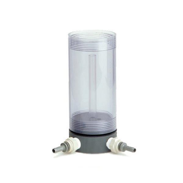 Installation of the YSI 6601 flow cell is easy. Simply unscrew the bottom plate from the calibration cup assembly and screw the flow cell module into the bottom of the calibration cup. Once secure, water can be pumped to the flow cell with a user-supplied pump. Water enters through the bottom of the flow cell, and passes through a diffuser plate. The water will drain down the center tube of the flow cell after the cup is filled. This design ensures that flow is distributed evenly through the cell, eliminating dead zones of no flow along the sides.